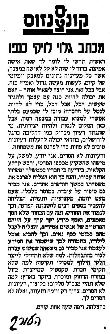 "סיפור אמיתי" ללא שם או כתובת. האם הוא אמיתי? ואפילו אם הוא כן, אני חולק עליו. נראה לי שתגובה הומוריסטית תעביר טוב יותר את הרגשתי כלפי מסר כזה ודומיו."דבר אחר" בידיעות אחרונות, יום שישי 25/07/2003.