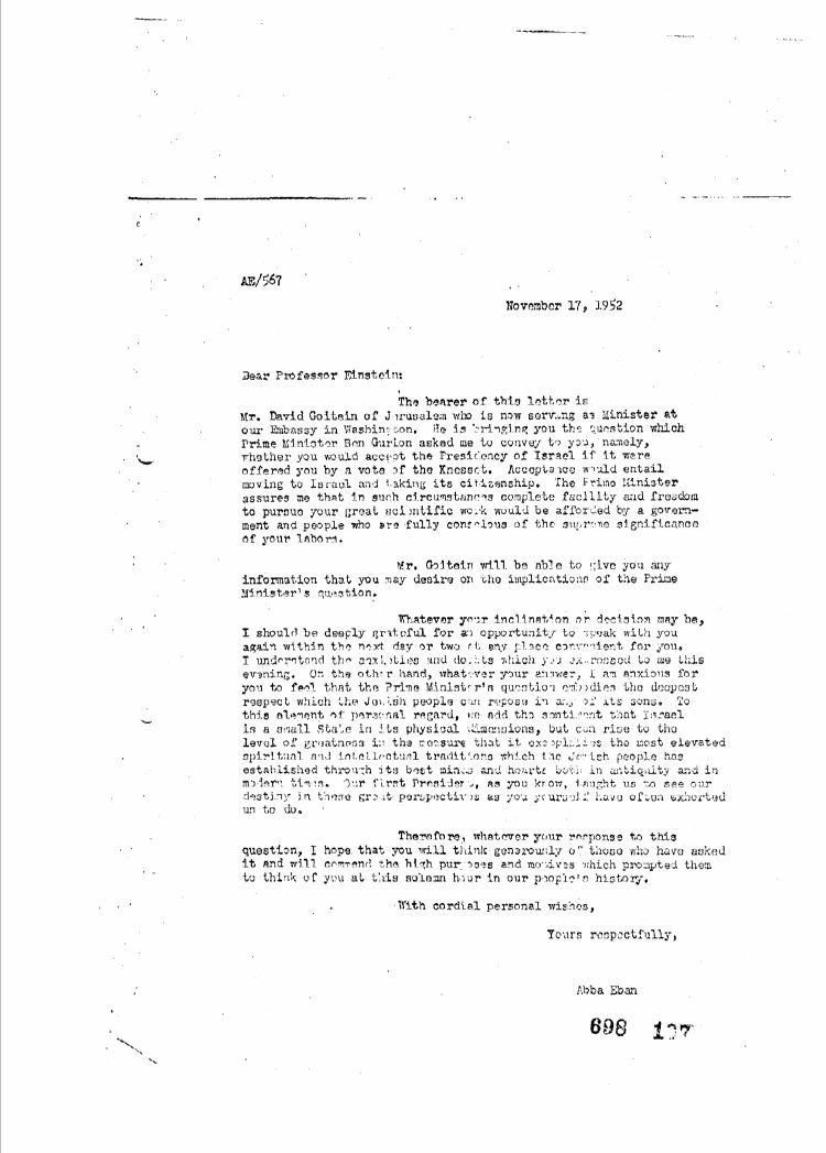 מכתב זה שנכתב על ידי אבא אבן הועבר לאלברט איינשטיין בידיו של ציר ישראל בשגרירת וושינגטון. לצפיה במכתב