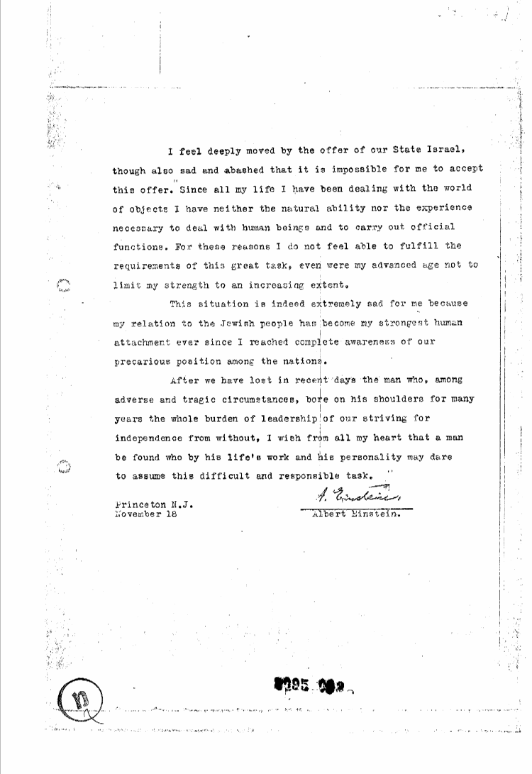 אלברט איינשטיין אכן קיבל הצעה מדוד בן גוריון להיות נשיא מדינת ישראל, ואכן סירב לה. בארכיון בן גוריון לא נמצאת הגרסה ה"לא רשמית" של מכתבו של איינשטיין לבן גוריון. ולכן לא ברור לי מאיפה צץ הטקסט הזה ומה המוטיבציה של מישהו להמציא טקסט שכזה ולהפיץ אותו.