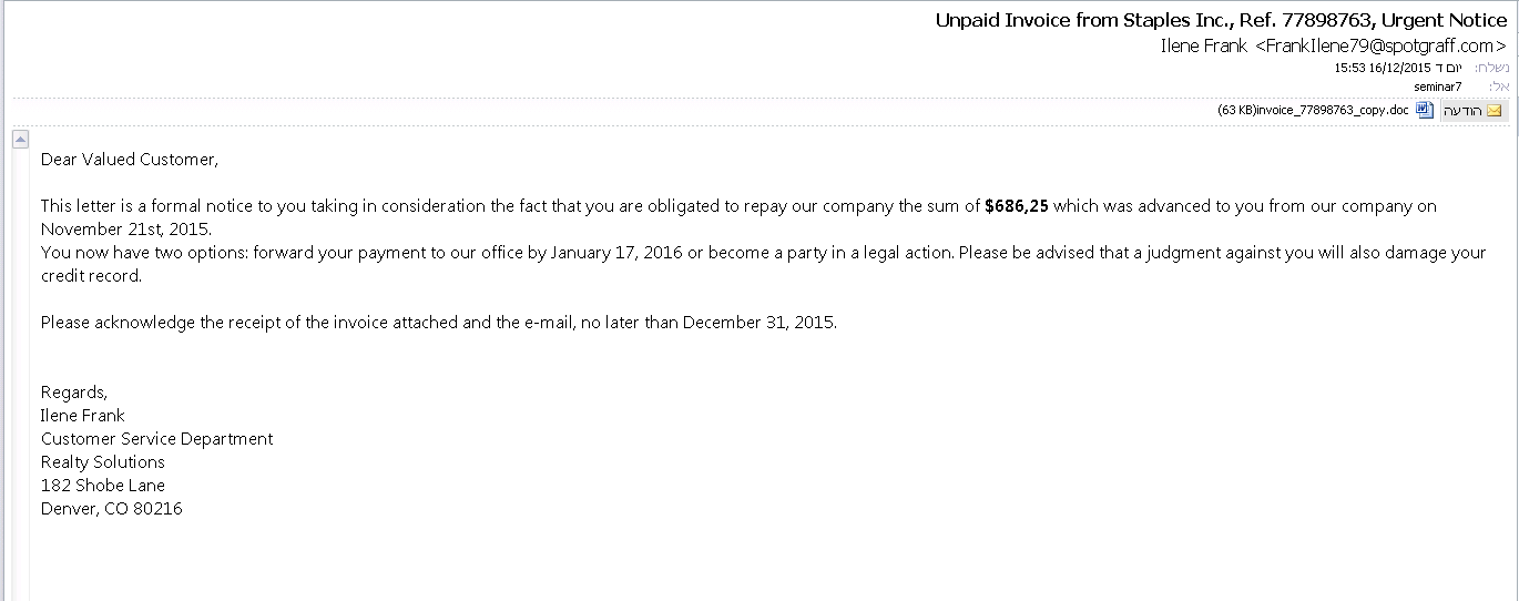 3. לא פותחים שום מסמך ממקור לא ידוע, אפילו אם מפחידים אתכם שאתם חייבים כסף או שיסגרו לכם שירות חשוב.