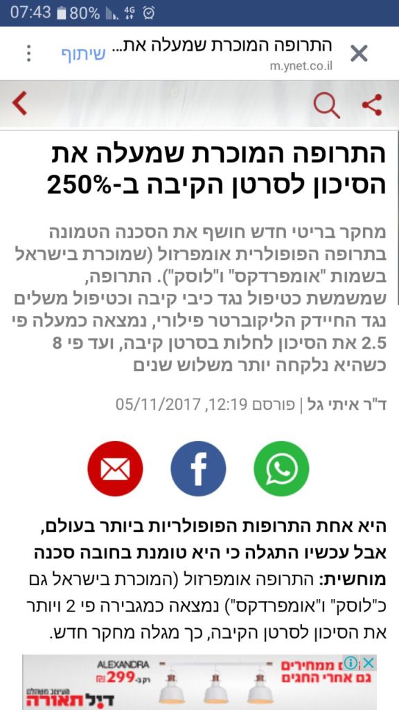 מסתובב צילום מסך של כתבה מאת ד"ר איתי גל ב Ynet - התרופה המוכרת שמעלה את הסיכון לסרטן הקיבה ב-250%מחקר בריטי חדש חושף את הסכנה הטמונה בתרופה הפופולרית אומפרזול (שמוכרת בישראל בשמות "אומפרדקס" ו"לוסק"). התרופה, שמשמשת כטיפול נגד כיבי קיבה וכטיפול משלים נגד החיידק הליקוברטר פילורי, נמצאה כמעלה פי 2.5 את הסיכון לחלות בסרטן קיבה, ועד פי 8 כשהיא נלקחה יותר משלוש שנים