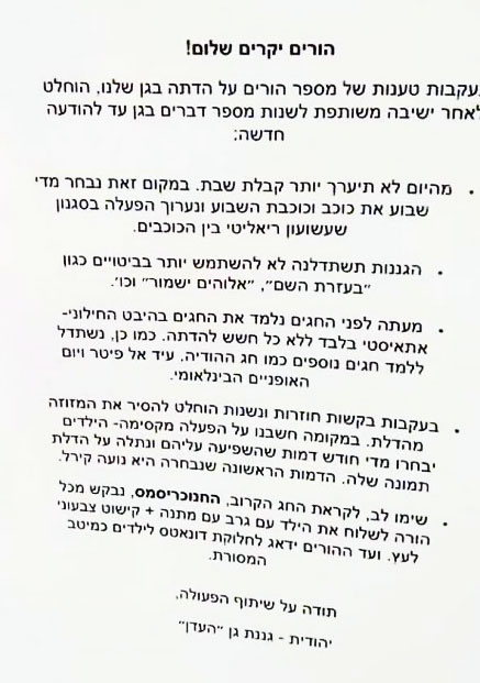 קראתי את המכתב ואת שם הגננת החתומה עליו. ברור שזהו מכתב שמיועד לעקוץ את החולים בהדתופוביה. מחלה חדשה שתקפה את מדינת היהודים, ושעיקרה צביעות. כי למשל, כשזה נח אז אין כמו חופשות החגים, וכשזה לא נח אז זו הדתה. וכן, ללמד דת שאינה יהודית ואת חגיה זו אינה הדתה, אבל ללמד דת יהודית וחגיה זו הדתה. וכן כל כיוצא בזה.