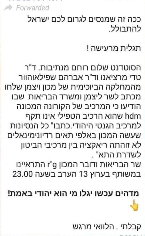 הסוטדנט שלום רוחם מנתינות. ד"ר טדי מרציאנו וד"ר אברהם שפילאוהוור מהמחלקה הביוכימית של מכון ויצמן שלחו מכתב לשר ליצמן ומשרד הבריאות שבו הודיעו כי המרכיב של הקורונה המכונה hdm שהוא הרכיב הטפילי אינו תקף למרכיב הגנטי היהודי.כתבו" כל הנסיונות שעשה המכון באלפי תאים רדיונימינאלים לא זוהתה ריאקציה בין מרכיבי הביטון לשדרת התא" .שר הבריאות ודובר המכון r"g התראיינו במשותף בערוץ 13 הערב בשעה 23:00