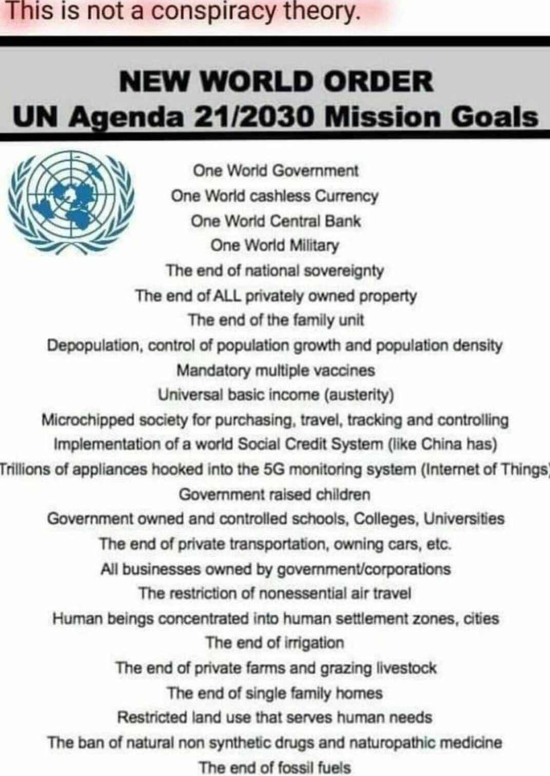 הרשימה המופרכת הזו טוענת שהיא תקציר של תכנית האו"ם 21/2030. למעשה, זהו מעין "תוכן העניינים" של כל תיאוריות הקונספירציה שהסתובבו בתקופת הקורונה. אין תכנית כזו של האו"ם אלא יש שתי תכניות ובאף אחת מהן לא כתובים הדברים. הראשונה היא אג'נדה 21 של האו"ם שנחתמה בריו בשנת 1992. השניה היא אג'נדה 2030 לפיתוח בר קיימא של האו"ם. לקריאת המסמך המקורי (באנגלית) של אג'נדה 21. לקריאת באתר האו"ם (באנגלית) אודות אג'נדה 2030.המקור: