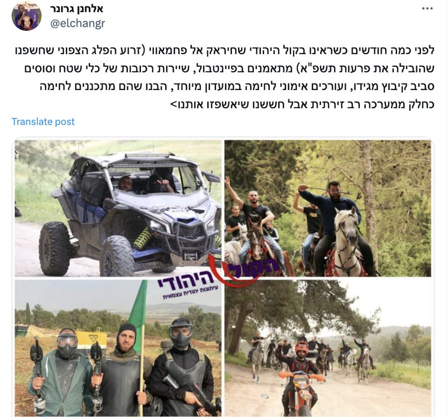 קבוצת ערבים מאום אל פחם, השייכת לפלג הצפוני של התנועה האסלאמית, תועדה כשהיא מבצעת אימוני קרב סמוך לקיבוץ מגידו, כך פרסם אלחנן גרונר מאתר "הקול היהודי" • ההערכות הן כי בכוונתם להצטרף למערכה רב זירתית ביום פקודה • גרונר קורא לרשויות לפעול בהתאם: "היום התרחיש הזה פשוט ומובן לרבים''