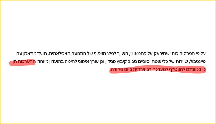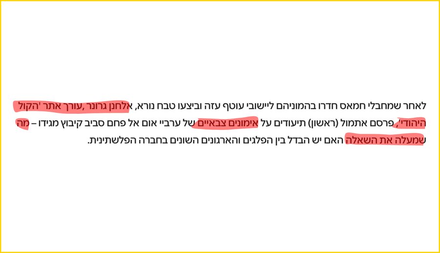 הכתבה עצמה דלה במיוחד עם 4 פסקאות לכל היותר. הראשונה מדברת על ״אימונים צבאיים״ אבל לא מספקת הוכחה לכך. אפילו לא מוזכרת בה העובדה כי מדובר ב״אימוני״ פיינטבול. בהיעדר הוכחה נותר לערוץ 14 רק ״להעלות שאלה״ ולרמוז מה התשובה.