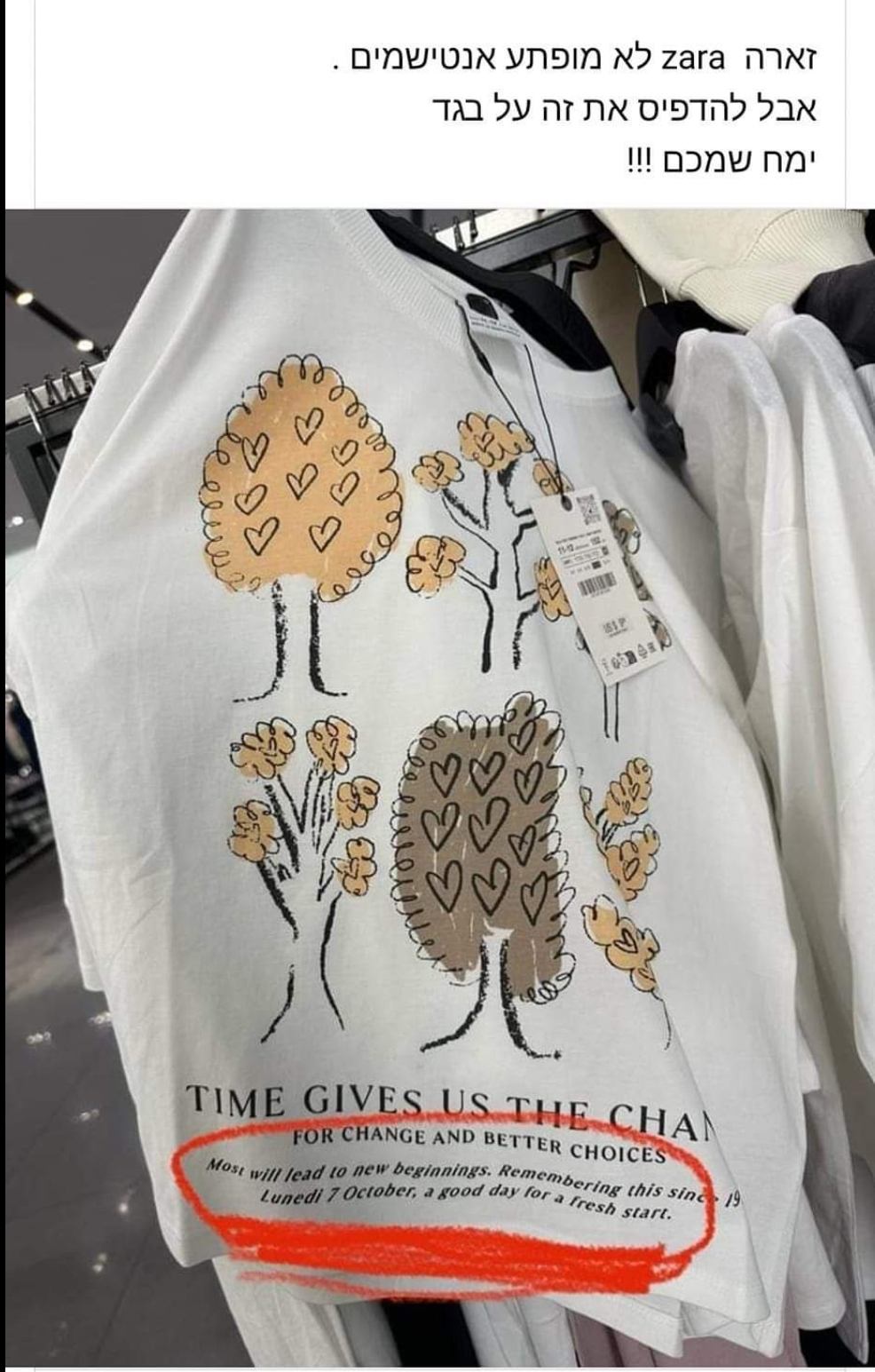 בזמן מלחמה הדם מתחמם אבל כדאי להפעיל קצת הגיון. היום עברו שבועיים מאז תחילת המלחמה. נראה לכם הגיוני שזארה תייצר חולצה חדשה ותספיק לשלוח אותה לחנויות בכל העולם?אז אחרי שהפעלנו קצת הגיון, בואו נראה מה באמת כתוב על החולצה.