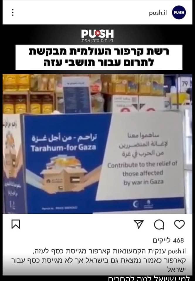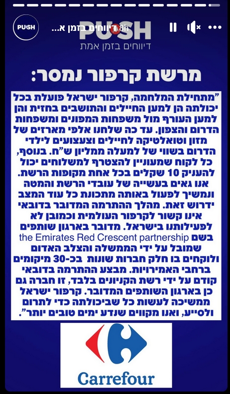 לא מצאתי את הידיעה המקורית בפייסבוק של push, אולי נמחקה. מצאתי את התגובה של חברת קרפור.מרשת קרפור נמסר: "מתחילת המלחמה, קרפור ישראל פועלת בכל יכולתה הן למען החיילים והתושבים בחזית והן למען העורף מול משפחות המפונים ומשפחות הדרום והצפון. עד כה שלחנו אלפי מארזים של מזון וטואלטיקה לחיילים וצעצועים לילדי הדרום בשווי של למעלה ממליון ש”ח. בנוסף, כל לקוח שמעוניין להצטרף למשלוחים יכול להעניק 10 שקלים בכל אחת מקופות הרשת. אנו גאים בעשייה של עובדי הרשת והמטה ונמשיך לפעול באותה מתכונת כל עוד המצב ידרוש זאת. מהלך ההתרמה המדובר בדובאי אינו קשור לקרפור העולמית וכמובן לא לפעילותנו בישראל. מדובר בארגון שותפים בשם the Emirates Red Crescent partnership שמובל על ידי הממשלה והצלב האדום ולוקחים בו חלק חברות שונות בכ-30 מיקומים ברחבי האמירויות. מבצע ההתרמה בדובאי קודם על ידי רשת הקניונים בלבד, זו חברה גם כן בארגון השותפים המדובר. קרפור ישראל ממשיכה לעשות כל שביכולתה כדי לתרום ולסייע, ואנו מקווים שנדע ימים טובים יותר".