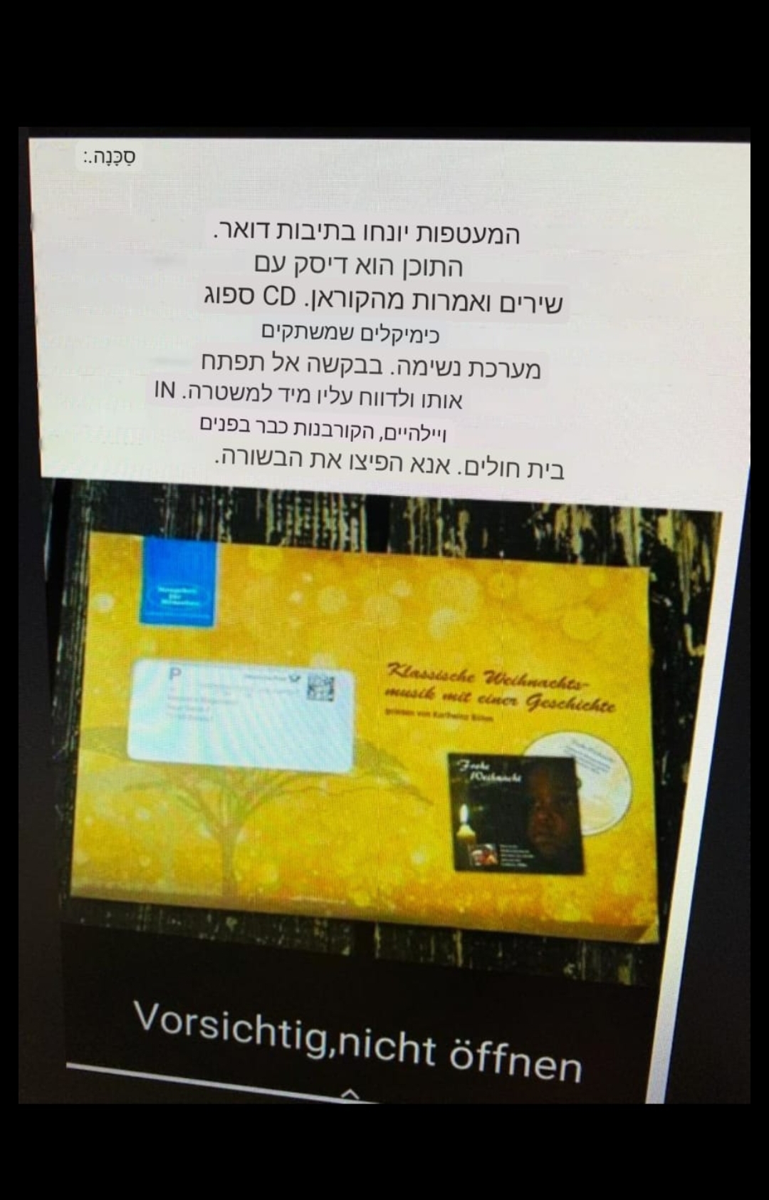 המעטפות יונחו בתיבות דואר. התוכן הוא דיסק עם שירים ואמרות מהקוראן. CD ספוג כימיקלים שמשתקים מערכת נשימה. בבקשה אל תפתח אותו ולדווח עליו מיד למשטרה, IN ויילהיים, הקורבנות כבר בפנים בית חולים. אנא הפיצו את הבשורה.