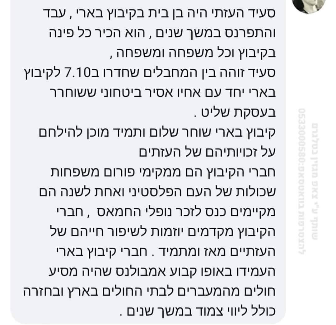 סעיד העזתי היה בן בית בקיבוץ בארי, עבד והתפרנס במשך שנים, הוא הכיר כל פינה בקיבוץ וכל משפחה ומשפחה, סעיד זוהה בין המחבלים שחדרו ב7.10 לקיבוץבארי יחד עם אחיו אסיר ביטחוני ששוחרר בעסקת שליט קיבוץ בארי שוחר שלום ותמיד מוכן להילחם על זכויותיהם של העזתים חברי הקיבוץ הם ממקימי פורום משפחות שכולות של העם הפלסטיני ואחת לשנה הם מקיימים כנס לזכר נופלי החמאס, חברי הקיבוץ מקדמים יוזמות לשיפור חייהם של העזתיים מאז ומתמיד . חברי קיבוץ בארי העמידו באופו קבוע אמבולנס שהיה מסיע חולים מהמעברים לבתי החולים בארץ ובחזרה כולל ליווי צמוד במשך שנים.