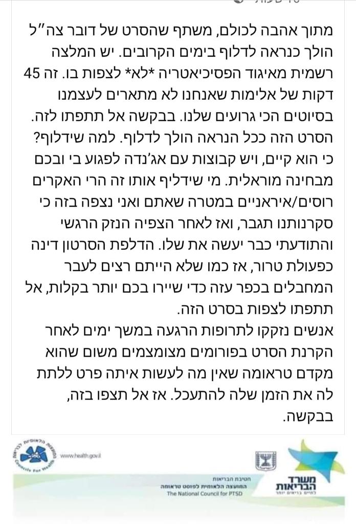 המועצה הלאומית לפוסט טראומה, מבקשת להתריע כי הצפייה בסרט ההסברה, המתעד את הזוועות שלא יומנו שקרו בעוטף ישראל בתאריך ה-7 באוקטובר חייבת לשמש רק לייעודה, ובאופן מצומצם ביותר.