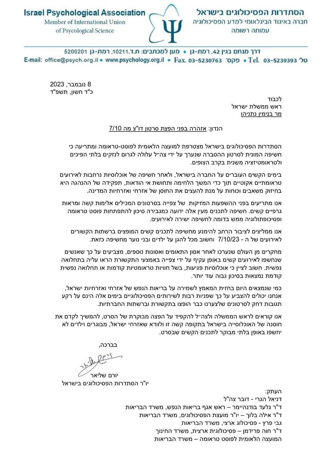 כמי שנמצאים היום בחזית המאמץ לשמירה על בריאות הנפש של אזרחי ואזרחיות ישראל, אנחנו יכולים להצביע על כך שפניות רבות לשירותים הפסיכולוגיים בימים אלה הינם על רקע תגובות דחק לסרטונים שלצערנו כבר הופצו בתקשורת וברשתות החברתיות. אנו קוראים לראש הממשלה ולצה"ל להקפיד על הפצה מבוקרת של הסרט, להמשיך לקדם את חוסנה של האוכלוסייה בישראל בתקופה קשה זו ולוודא שאזרחי ישראל, מבוגרים וילדים לא יחשפו באופן בלתי מבוקר לתכנים הקשים שבסרט.