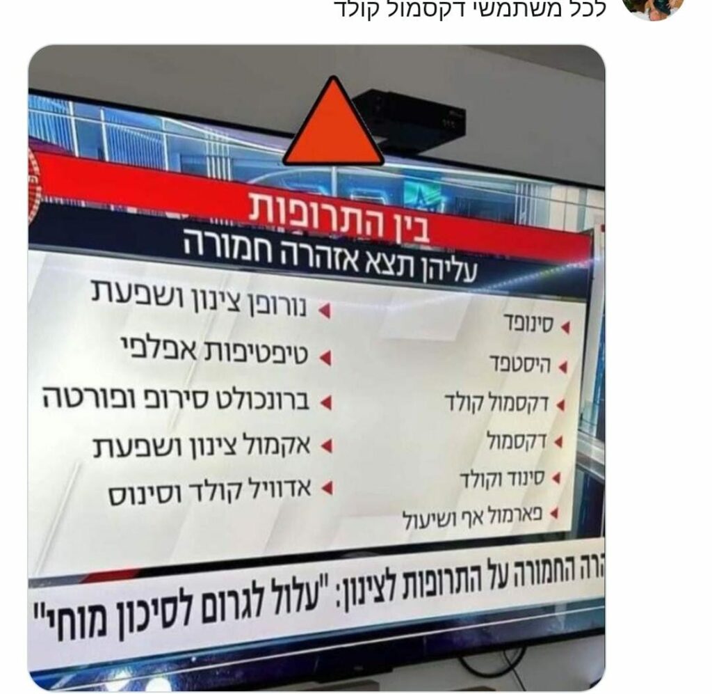 אזהרה החמורה על התרופות לצינון: "עלול לגרום לסיכון מוחי"בין התרופות עליהן תצא אזהרה חמורה: סינופד, היסטפד, דקסמול קולד, דקסמול, סינוד וקולד, פארמול אף ושיעול, נורופן צינון ושפעת, טיפטיפות אפלפי, ברונכולט סירופ ופורטה, אקמול צינון ושפעת, אדוויל קולד וסינוס