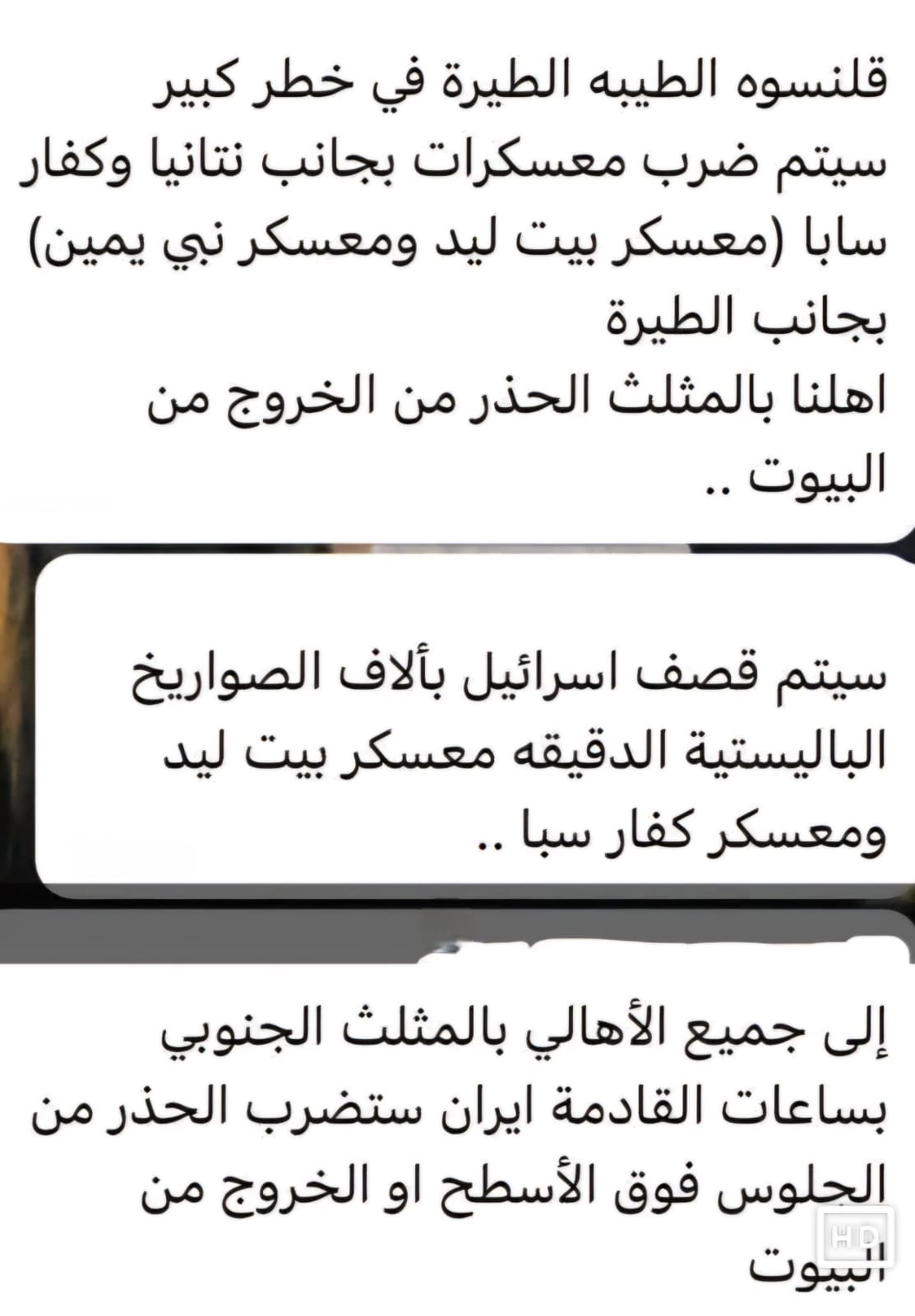 "לכל אנשי המשולש הדרומי, בשעות הקרובות איראן תתקוף, הזהרו לא לשבת על גגות ולא לעזוב בתים."