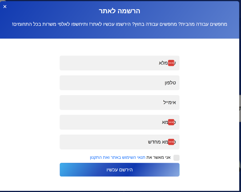 יש אתר של חיפוש עבודה מהבית- שמי שנרשם אליו ומסמן וי בתנאי התקנוןמתחייב שהוא נרשם לאתר לכל החיים, וכן מתחייב ש מהחודש השני והלאה משלם עלות חודשית